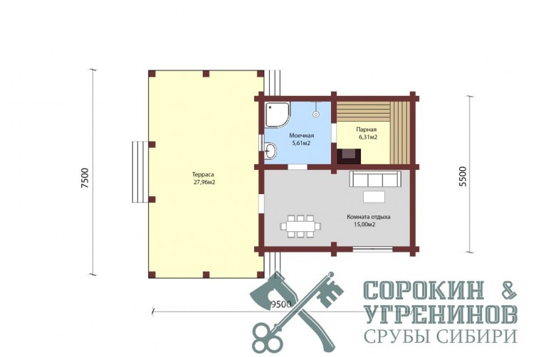 Рубленая баня из лафета кедра, общей площадью 54м2, баня 26 м2 и терраса 26м2. Размер сруба 7,5х9,5 метров по осям. Планировка бани, парная, душевая, комната отдыха, и большая терраса. Сруб рубленый в норвежский замок. Объем лафета в срубе 40м3.